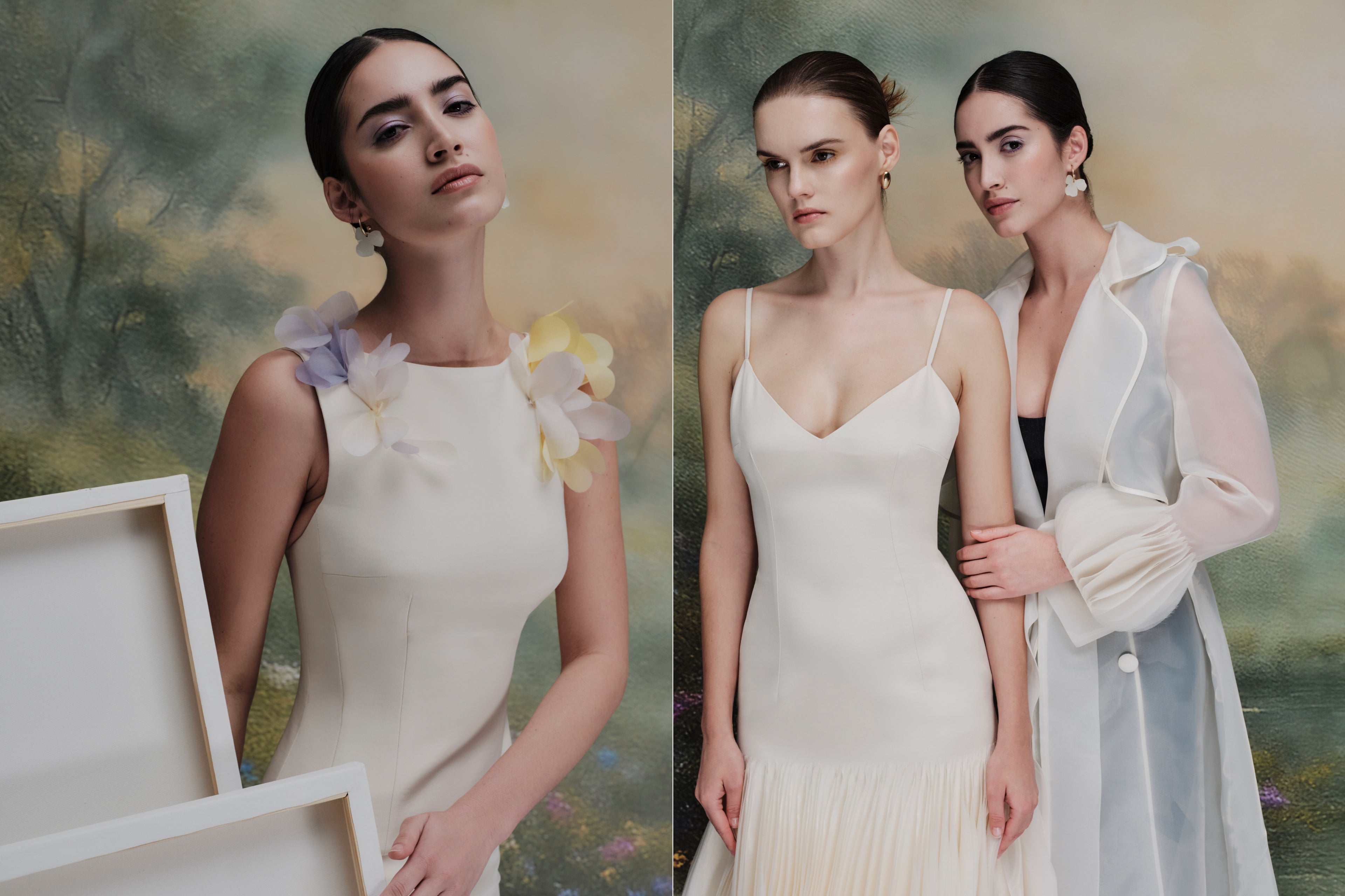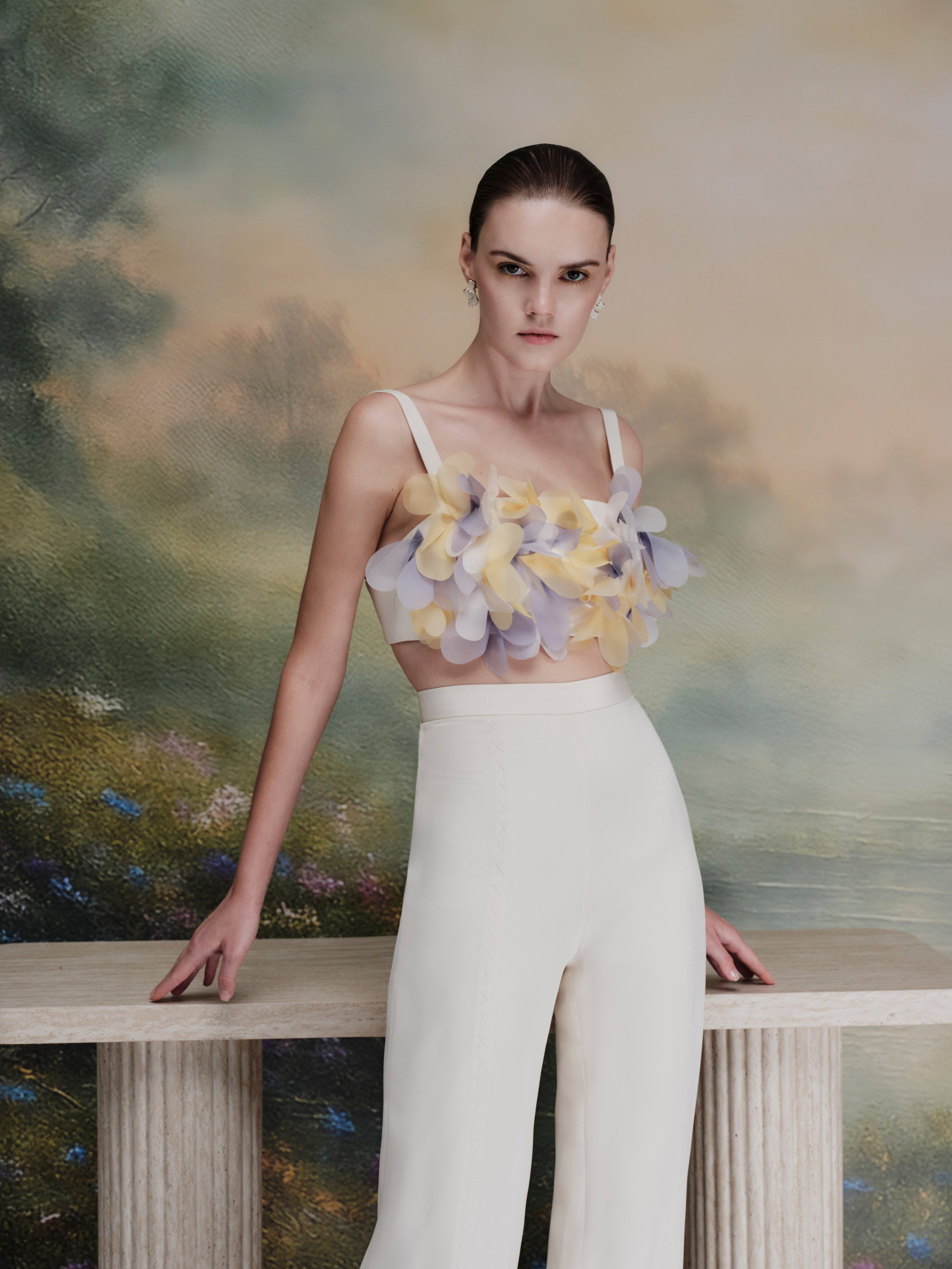 The house’s first chapter unfolds in daylight. The Spotlight is a debut of pieces made for the quiet brilliance of day—ivory silk crepe, sheer organza, and sculpted shapes cut to move from a sunlit gallery opening to an after-dusk dinner without a pause. 3-D blossoms and gossamer layers catch the morning glare, then shift into a soft evening glow, like a spotlight that follows its lead across hours. It’s Foyett’s prologue: modern, effortless, and designed for the moments when presence matters more than spectacle.